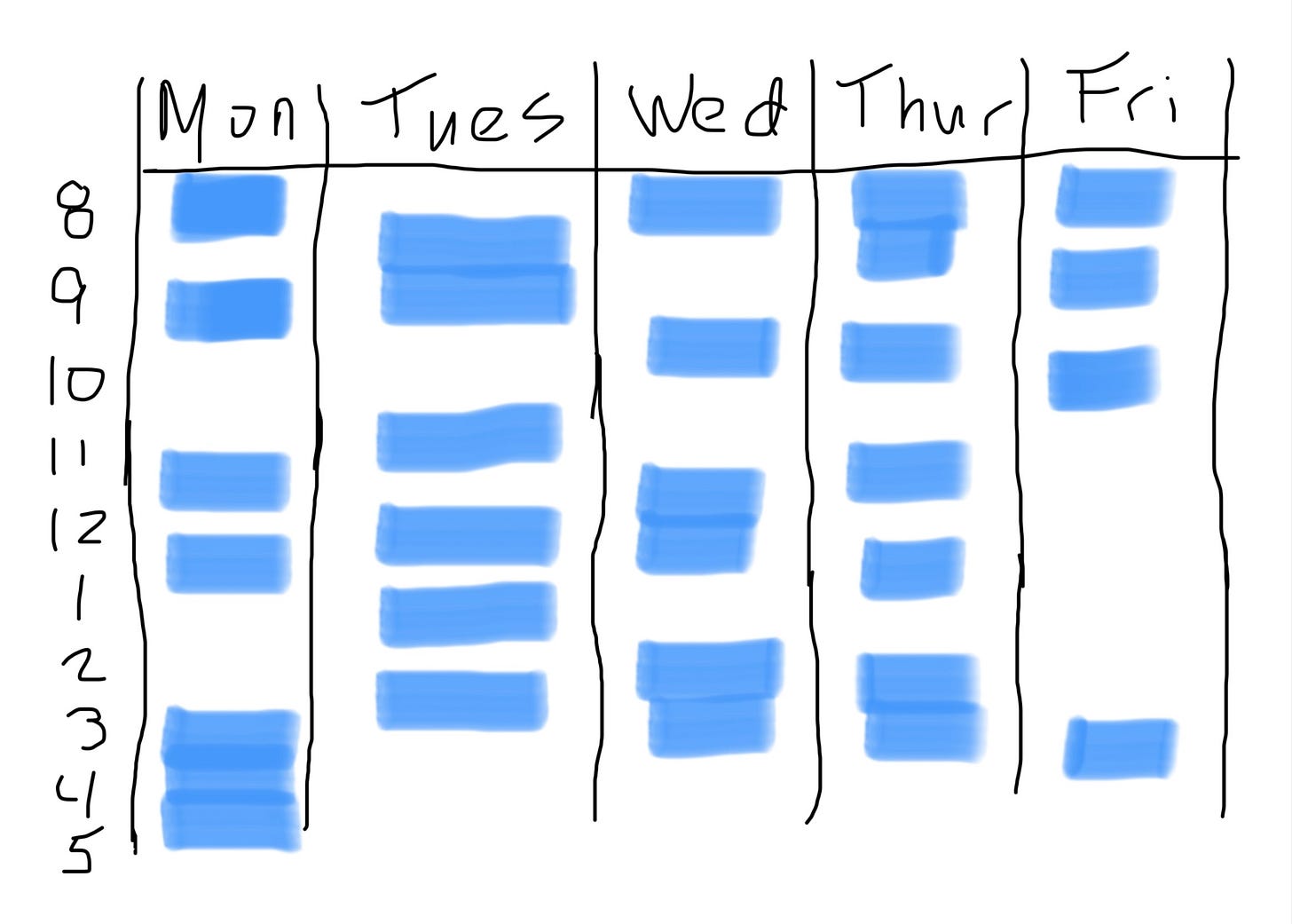Lara Hogan’s post on defragging your calendar inspired me to begin optimizing my calendar as a tool to enable deep work, not prevent it. My old calendar was filled with short 30-minute gaps between meetings, looking something like the example calendar below: